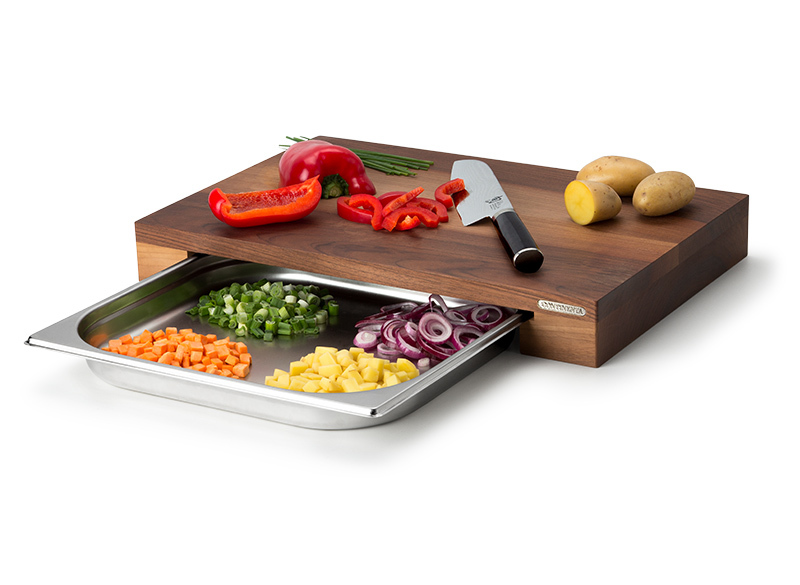 Continenta-Schneidebretter mit Edelstahlschublade. Es besteht aus hochwertigem Walnussholz, das nicht nur sehr hart ist, sondern auch über eine unverwechselbare Textur und eine bestechende dunkle Farbe verfügt. Continenta verwendet ausschließlich Holz aus nachhaltiger Forstwirtschaft. Dieses stabile Brett schützt Ihre Messer optimal vor dem Abstumpfen. Es ist mit Pflanzenöl veredelt, welches das Holz schützt und zudem die antibakterielle Wirkung unterstützt. Im Inneren des Brettes befindet sich eine integrierte Edelstahlschublade, in der Sie frisch geschnittenes Gemüse bequem sammeln können. Die Schublade ist beidseitig herausnehmbar und bis 250°C backofengeeignet. Die Schublade kann auch in der Spülmaschine gereinigt werden. Das Board verfügt an der Unterseite über Gummifüße, die ein Verrutschen des Boards auf der Oberfläche verhindern. Das Design des Boards wird durch ein Metalllogo ergänzt.