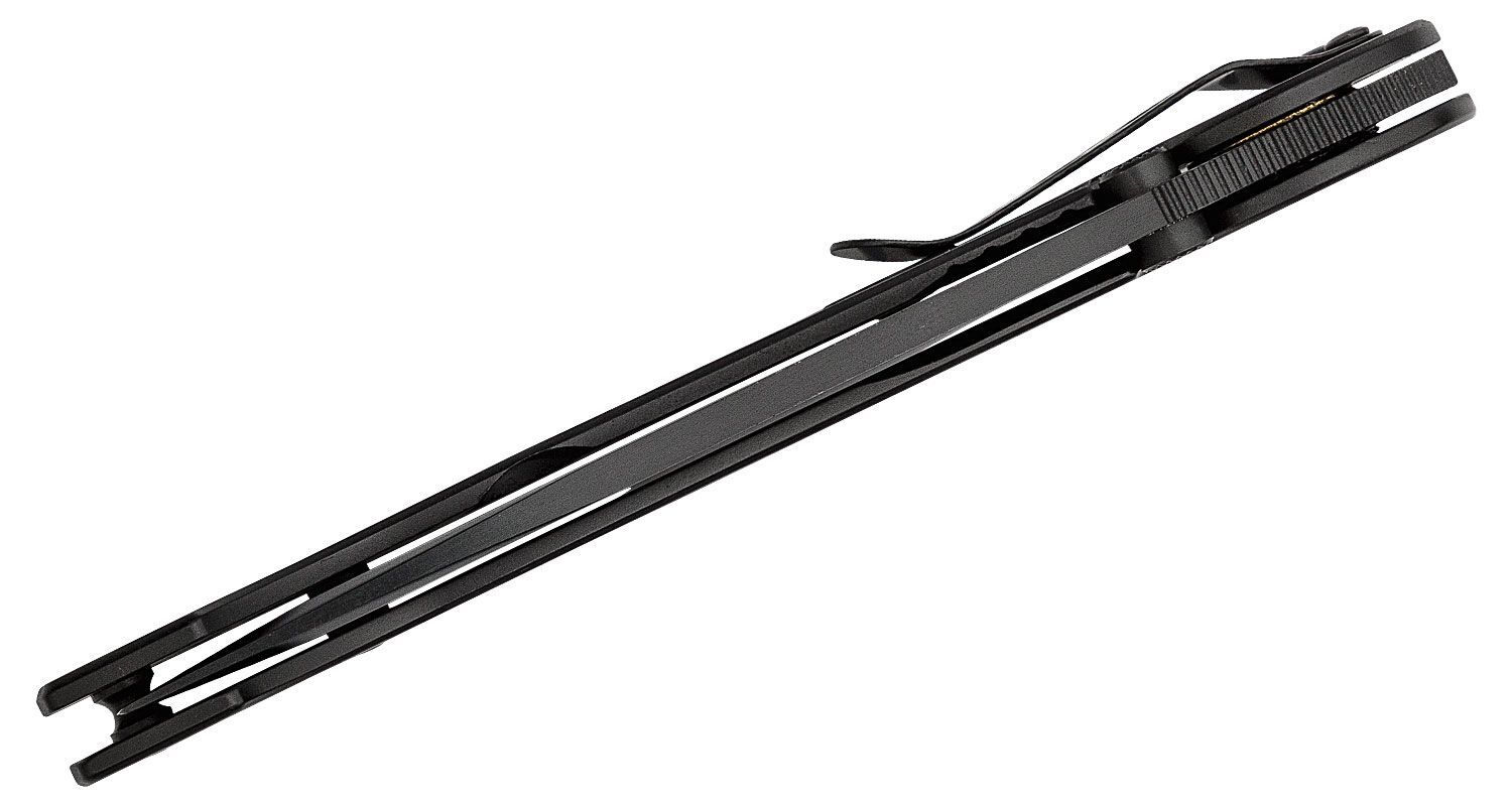 Schwarze Klinge aus rostfreiem Stahl 12C27, die in der offenen Position durch eine Framelock-Sicherung gesichert ist. Wird mit einem Flipper oder einem Daumenstift geöffnet. Griff aus rostfreiem Stahl mit schwarzem Finish. Auswechselbare Schnalle zum Tragen in der Hosentasche.