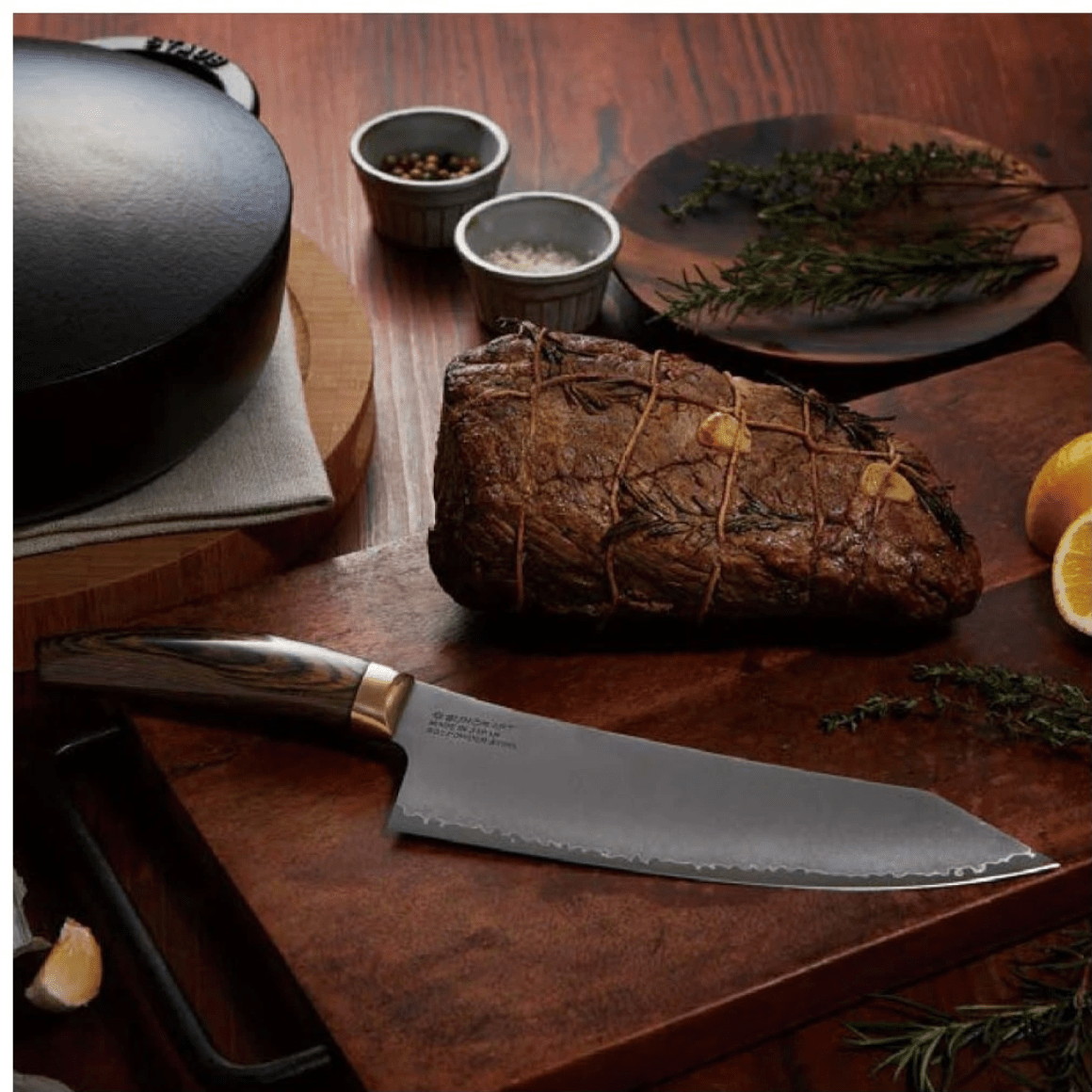 Japanisches Kochmesser DELLINGER Kiritsuke Suncraft Elegancia SG2 KSK-01 aus der Serie Suncraft Elegancia. Dieses Messer ist ideal für vielseitigen Einsatz – zum Schneiden von Fleisch, Filetieren von Fisch, Säubern von Fleisch und Fisch sowie für Obst und Gemüse. Die höhere Spitze ermöglicht zudem das Wiegen von Kräutern oder Nüssen.
