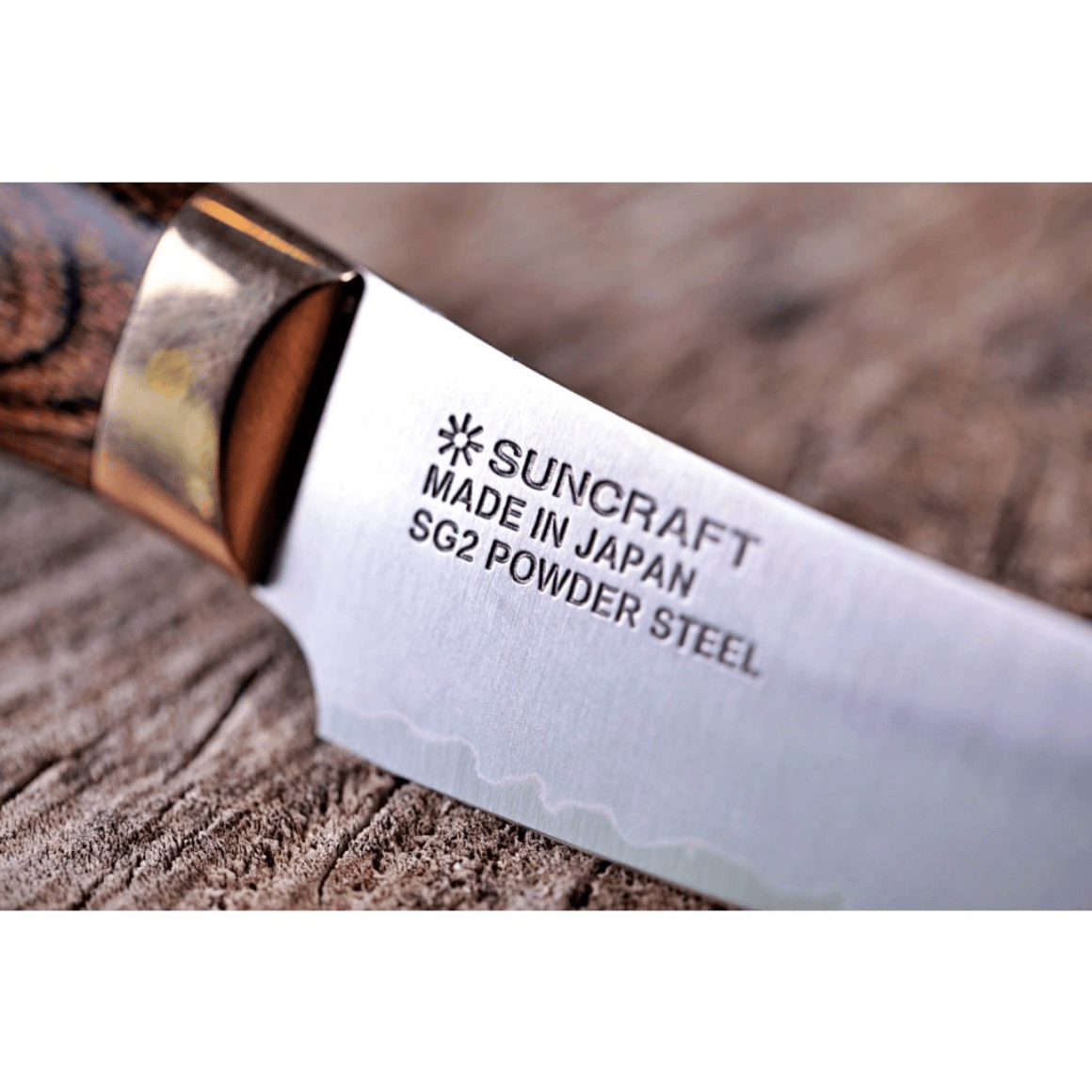 Die Klinge hat einen Kern aus hochwertigem SG2-Pulver-Edelstahl, der für seine extreme Schärfe, lange Lebensdauer und hohe Korrosionsbeständigkeit bekannt ist. Die 3-lagige "San Mai" Clad-Klinge zeigt ein wunderschönes, mehrschichtiges Muster, das die Haltbarkeit und Flexibilität der Klinge verbessert.