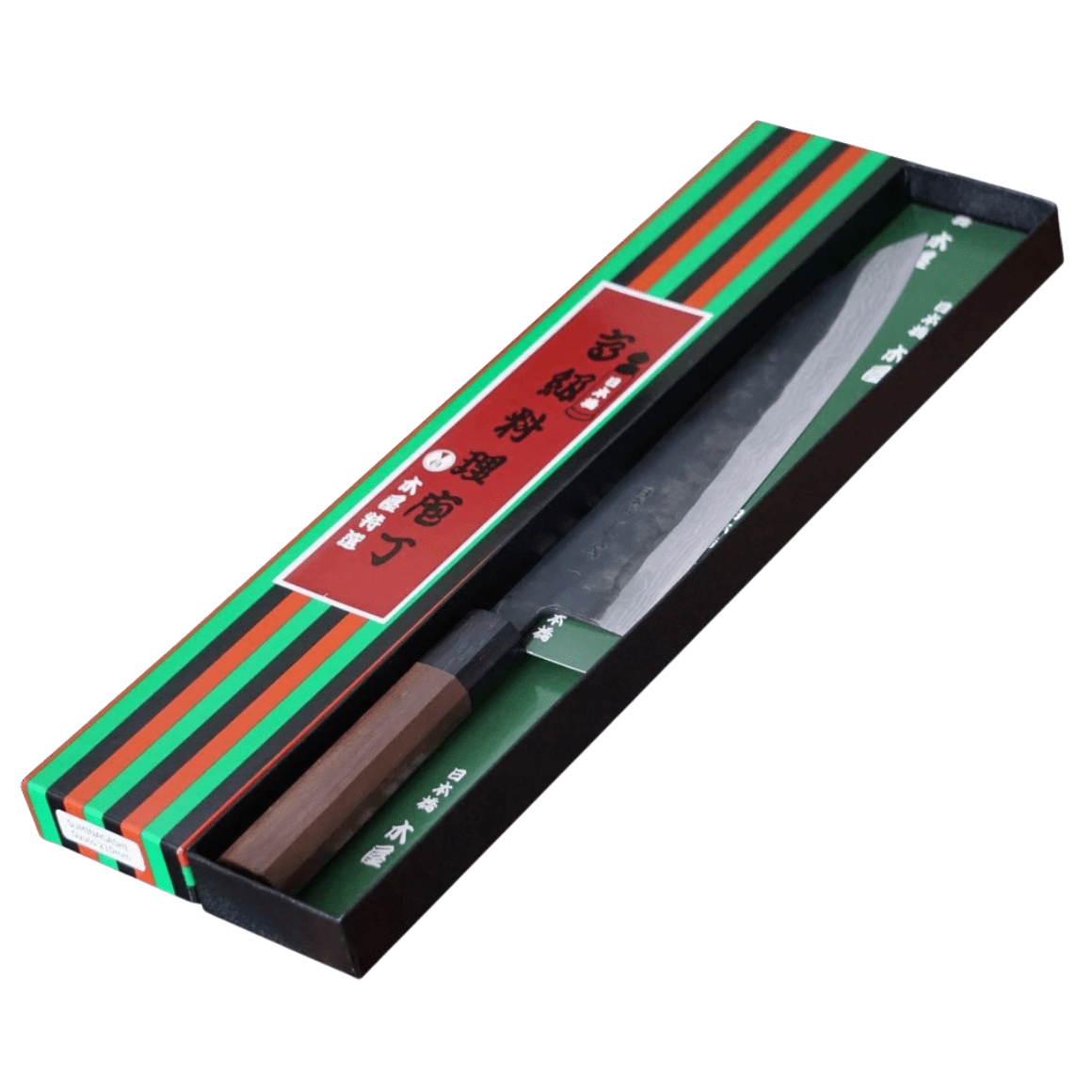 Der achteckige Griff besteht aus Sandelholz. Er wird stets sorgfältig von Hand poliert, ergonomisch geformt und für hervorragende Handhabung konzipiert. Dieses Messer ist sowohl für Rechts- als auch für Linkshänder geeignet.
