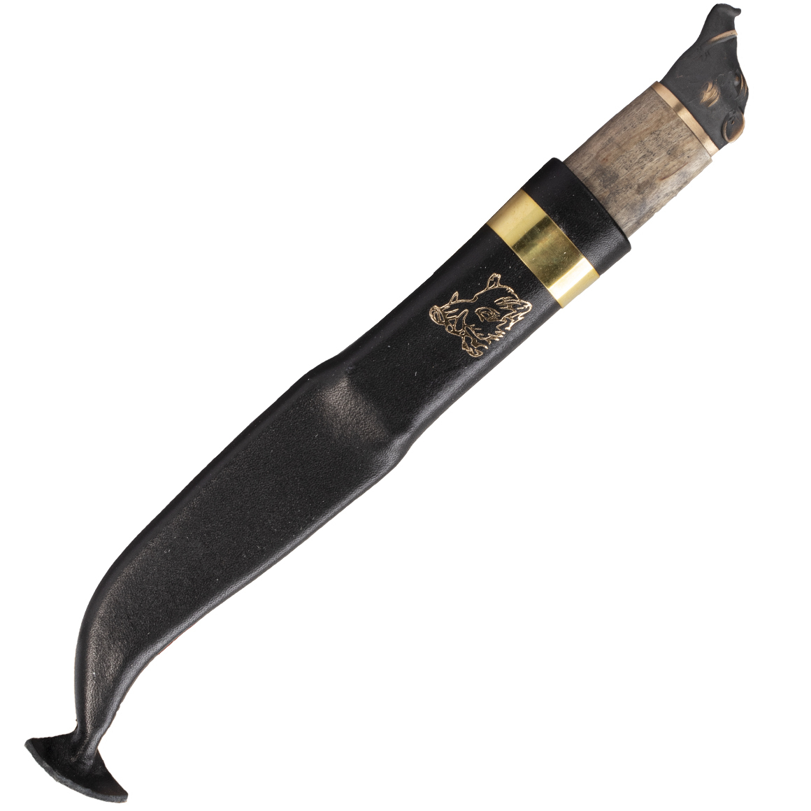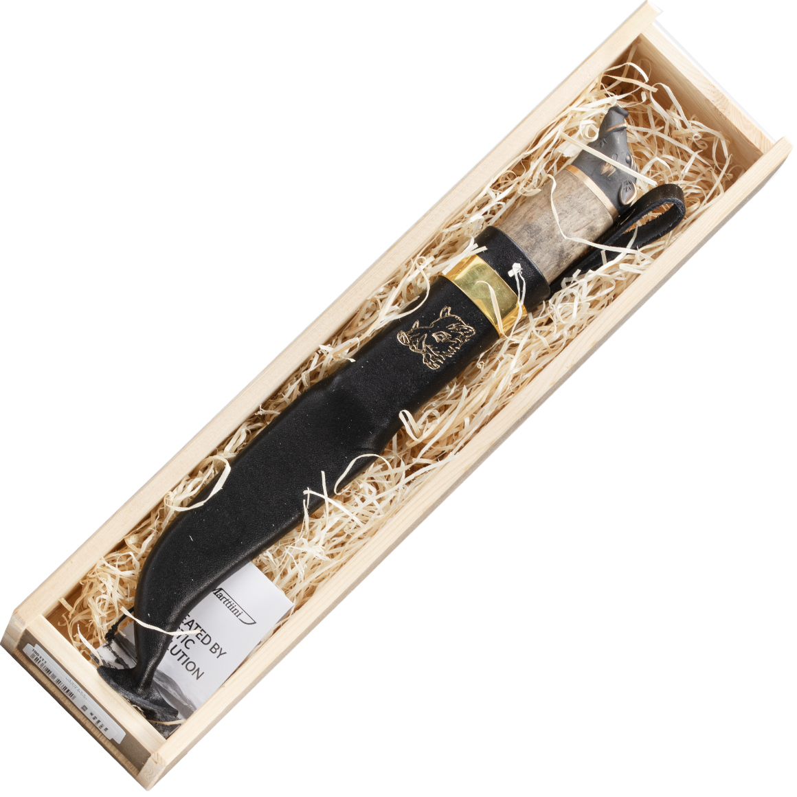 Das Marttiini Wildschwein -Jagdmesser ist eine ikonische Bronze-Ferse in Form eines Wildschweinkopfes. Der Griff besteht aus wärmebehandelter und gewachster lockiger Birke. Die Klinge besteht aus Edelstahl. Es enthält eine Ledertasche mit einem Wildschweinkopfmotiv. Kommt in einer hölzernen Geschenkbox.
