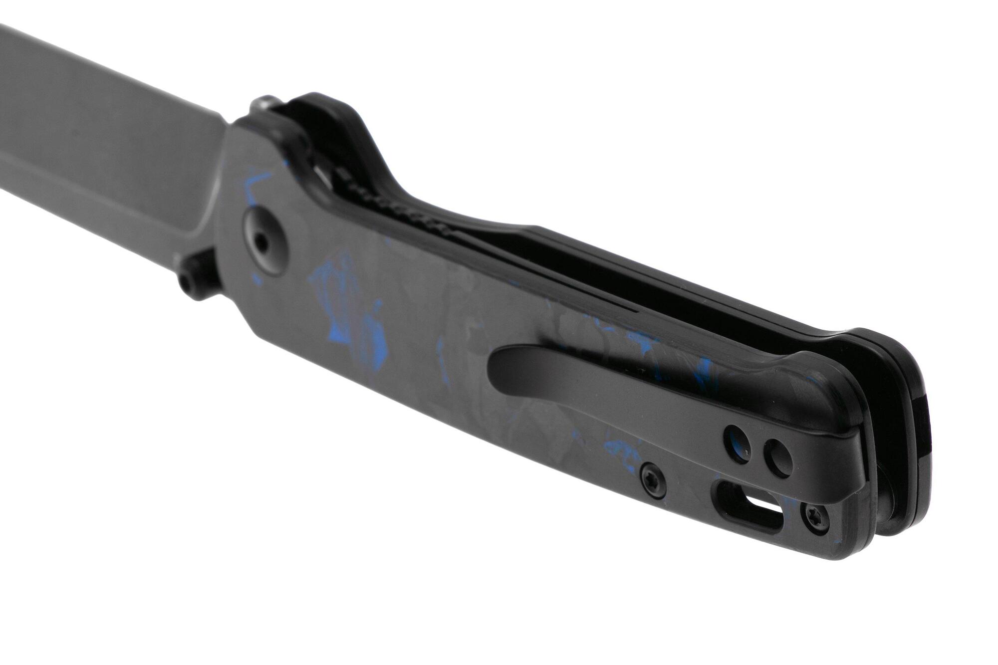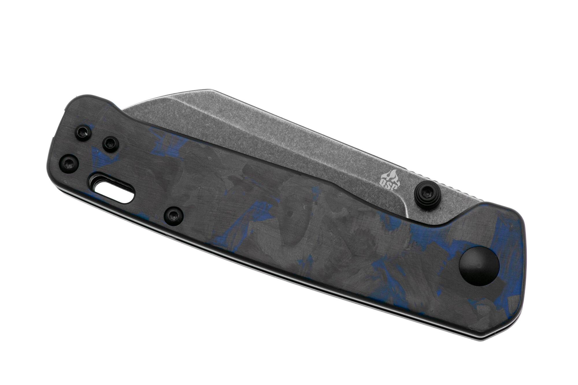 QPS Penguin V2 D2, schwarzer Stonewash, Griff: Blaues zerkleinertes CF-Overlay G10 QS130V2