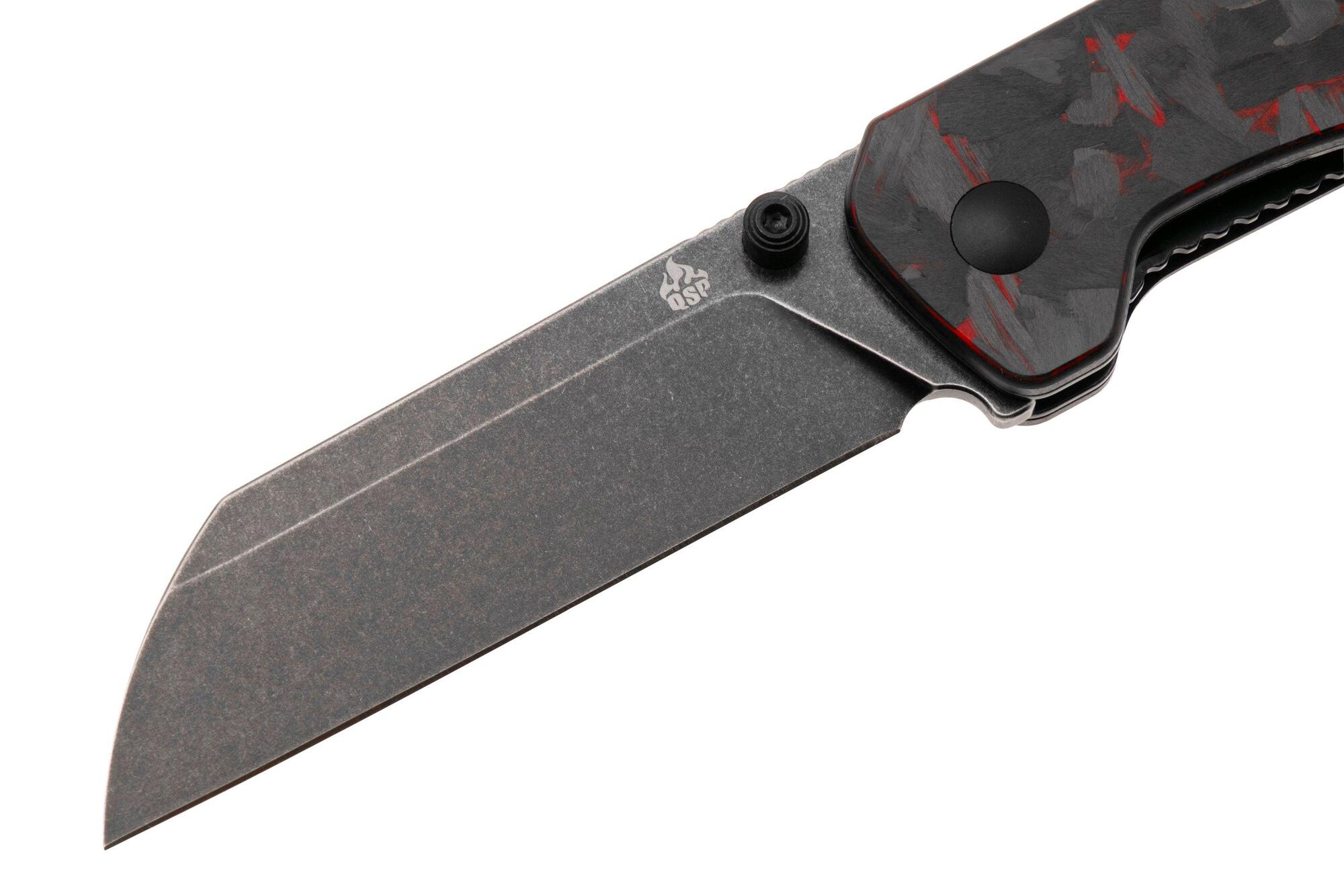 QPS Penguin V2 D2, schwarzer Stonewash, Griff: Roter geschredderter CF-Overlay G10 QS130V2-