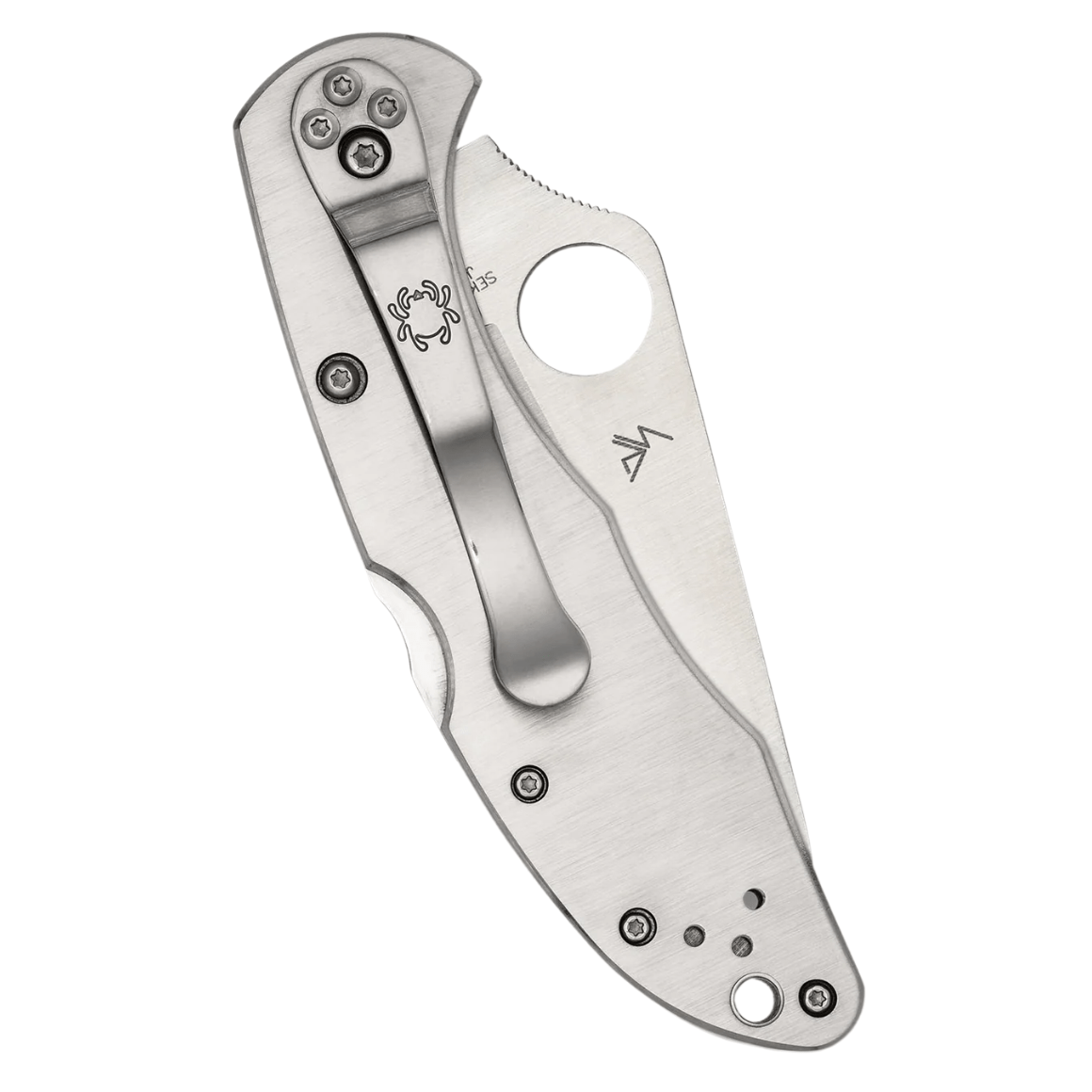 Die Klinge besteht aus VG-10-Stahl und ist auf halbe Länge gezahnt. Es hat ein rundes Loch zum einfachen Öffnen mit dem Daumen, daneben eine feine Rippung, um den Daumen beim Schneiden besser zu stützen. Der Griff besteht aus Edelstahl und hat ein Back Lock Back Lock. Der Taschenclip hat vier Positionen. Durch das Loch am Griff können Sie die Schnur einfädeln.