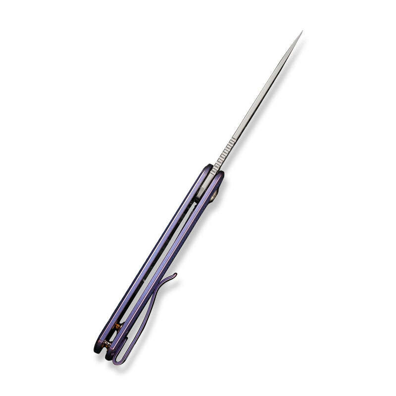 Die Klinge aus hochwertigem CPM 20CV-Stahl lässt sich mit einem Flipper öffnen und wird durch einen Framelock-Verschluss in der offenen Position gehalten. Der Griff ist aus Titan gefertigt. Das Messer ist mit einem Clip zum bequemen Tragen in der Tasche ausgestattet.